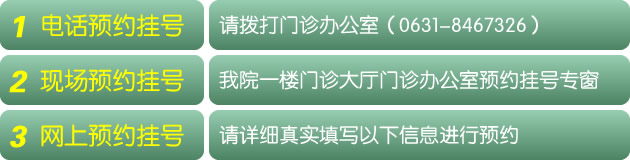 方便患者就診,減少候診時間,我院特推出預約掛號服務,具體有網上預約掛號、電話預約掛號和現場預約三種途徑。